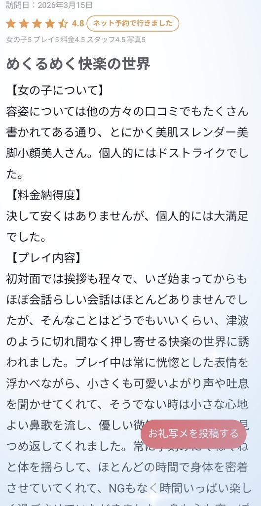 花宮 つむぎ 【お礼写メ日記】 2026年3月16日 17:20 口コミありがとうございます🕊 満点評価とても嬉しいです✨お兄様のどストライクで良かったです☺️ すごい丁寧に書いてくれてて嬉しいけど恥ずかしいような…(⑉・ ・⑉)💭いっぱい密着して濃厚な時間になりましたね🫧大満足して貰えてなにより🙌 また遊びに来てくださいね🎀 🌷花宮 つむぎ🌷