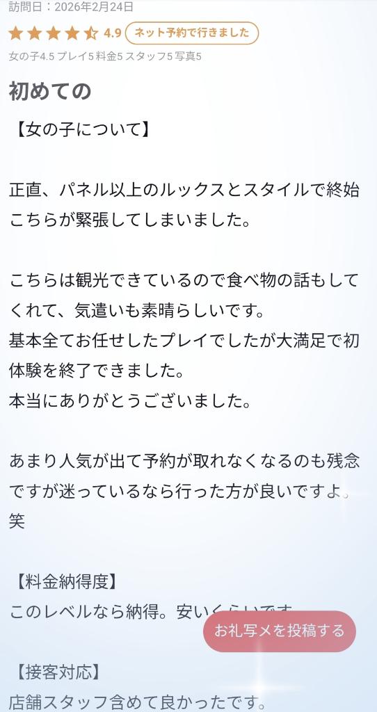口コミありがとうございます🕊 ほぼ満点評価でとても嬉しいです✨ お兄様が緊張しちゃうくらいのルックス☺️褒め上手ですね🙌 大満足の時間になったようで何よりです🫧また一緒に最高の時間過ごしましょうね🎀 🌷花宮 つむぎ🌷