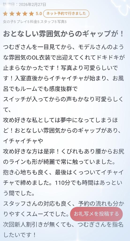 口コミありがとうございます🕊 満点評価とても嬉しいです☺️お兄様のことドキドキさせられて嬉しい🎶 時間いっぱいのいちゃいちゃもつむぎのギャップも、身体も楽しんで貰えたようで何よりです🙌🫧 またたくさん可愛がってね🌱 🌷花 […]
